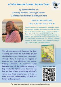 This talk centres around her book, Roop and the River Crossing, as well as the multimedia project Hum Hindustani, on children and citizenship. Through them, she explores the legacy of Partition, and how childhood and nation-building intersect. The talk examines what becomes part of the collective memory of big events like Partition and how we can look at that afresh by including children’s voices and lived experiences to build a more nuanced understanding of both our history and our present.
